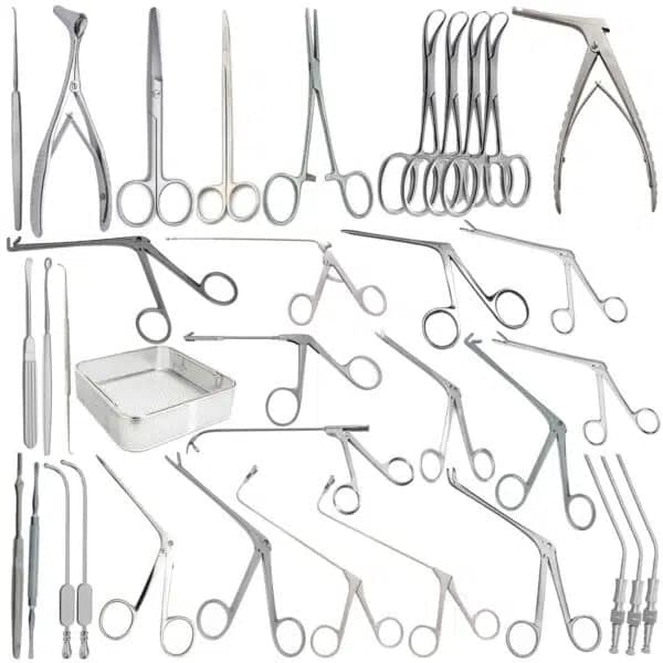 Nasal (Rhinology) Instruments: Used for endoscopic sinus surgery and nasal septal procedures. Common tools include nasal speculums (e.g., Killian, Hartmann), nasal forceps (e.g., Blakesley), septum elevators, rasps, and nasal snares.